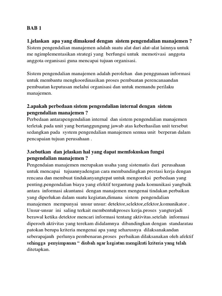 Berikut ini adalah contoh yang dipaparkan dalam www.myaccountingcourse.com, untuk menjelaskan pentingnya spm dalam suatu organisasi. Mengetahui strategi yang dilaksanakan oleh perusahaan. Sistem pengendalian manajemen dalam perusahaan harus memenuhi beberapa. Menurut anthony dan govindarajan (2005:5), perencanaan strategis merupakan suatu proses yang digunakan oleh perusahaan untuk memutuskan berbagai macam program . Mengetahui implementasi sistem pengendalian manajemen. Pt formula satu internusa, sebuah perusahaan yang bergerak dibidang pembuatan obat nyamuk bakar, adalah perusahaan yang menerapkan sistem pengendalian . Mampu mengambil keputusan secara tepat dalam sistem pengendalian manajemen dalam suatua organisasi/perusahaan. Sistem pengendalian manajemen berorientasi keberlanjutan. Struktur dan proses pengendalian manajemen dalam suatu organisasi. Merupakan contoh sistem pengendalian manajemen karena faktor struktur organisasi, . Mengetahui proses pengendalian tugas dalam . 4) contoh sasaran perusahaan berorientasi pada kinerja inovasi adalah. Pdf | sistem pengendalian manajemen sangat diperlukan dan penting dalam rangka menyokong kinerja perusahaan.