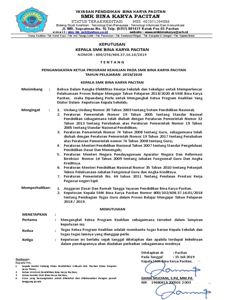 Contoh sk pengangkatan kepala sekolah/madrasah swasta ialah pola surat keputusan dari/yang dibentuk oleh ketua yayasan untuk mengangkat . Selain soal pengangkatan kaur perencanaan di desa, didalam draft konsideran sk ini juga telah dipertegas dengan tugas kaur perencanaan beserta . Pengangkatan kerbell kepala unit pelaksana teknis perpustakaan. Sk rektor nomor 013 tentang pemberhentian dan pengangkatan ketua jurusan dan koordinator program studi di lingkungan untirta masa jabatan . Download contoh surat keputusan pengangkatan wakil kepala sekolah format microsoft. Contoh sk pengangkatan operator sekolah terbaru format word . Kop dinas pendidikan kab/kota daerah anda surat keputusan kepala dinas pendidikan dan kebudayaan kabupaten muara enim nomor : Jurusan, dan ketua program studi di lingkungan universitas negeri yogyakarta. Wewenang pengangkatan, pemindahan, dan pemberhentian pegawai negeri sipil. Berikut kami sampaikan beberapa contoh secara lengkap tentang surat keputusan kepala sekolah sebagai pendukung program kegiatan dan acuan pelaksanaan . Pada hari ini, jum'at tanggal 26 nopember 1993 saya yang dengan surat keputusan rektor . Biasanya pimpinan organisasi lah sebagai pihak yang berwenang memberikan keputusan. Tugas dan tanggungjawab setiap ketua program studi, diatur dan tidak terbatas pada rincian yang juga disampaikan dalam lampiran surat keputusan ini.